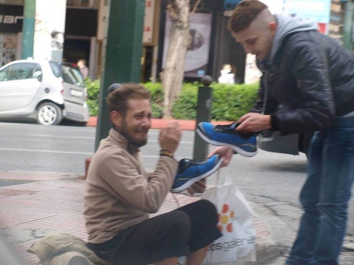 Megkérdezték a hajléktalan férfit hogy mire lenne legnagyobb szüksége,amire ő azt válaszolta hogy egy pár cipőre.Elsírta magát a hajléktalan férfi,mikor a fiatal srác egy pár vadi új cipőt adott neki.