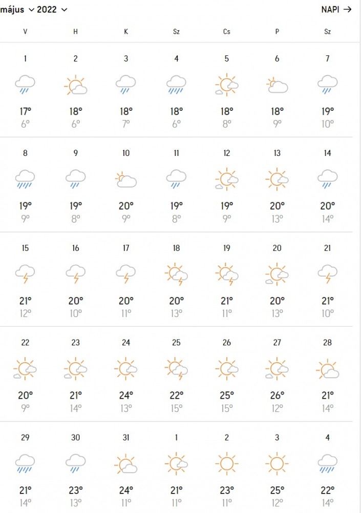 MÁJUSBAN a napsütés lesz az uralkodó : Az AccuWeather korai előrejelzései alapján a májusi hónap legalacsonyabb hőmérséklete 18, a legmagasabb pedig 26 fok lesz.