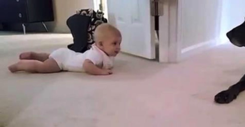 Nem gondolták azonban azt, hogy az első kúszó mozdulat ennyire édes lesz! A baba nagyon izgatottan mászik előre, egyre közelebb kerül a kutyához.