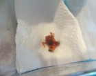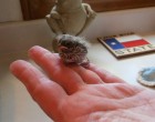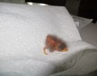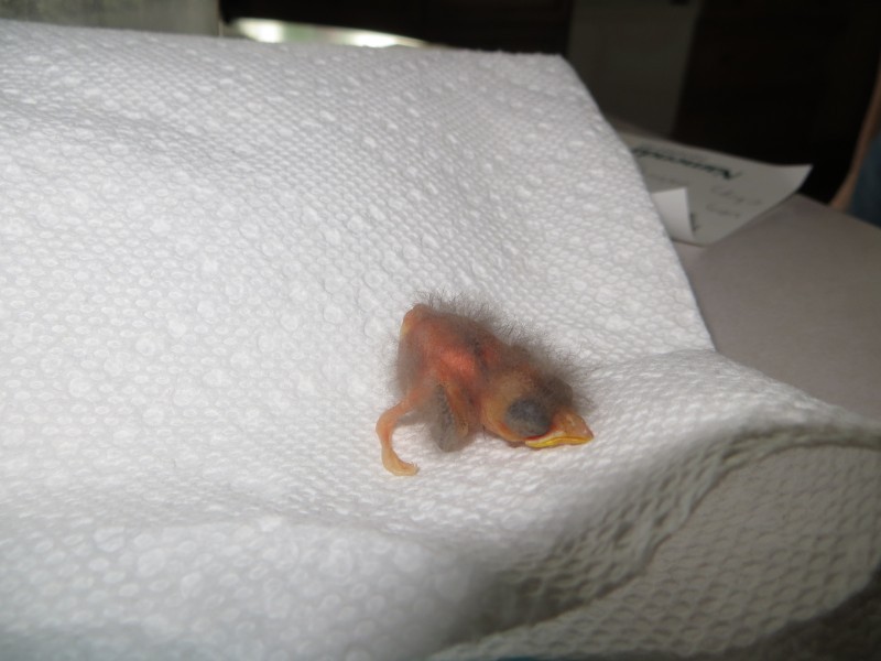 Még van rajta egy kis tojáshéj darab hiszen aznap kelt ki a tojásból. Sajnos nem találták meg a fészket, amiből kiesett.