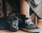 Yzma az örökbefogadott kutyus új otthonába érkezése után pár pillanattal gazdija lábánál a konyha padlóján.