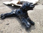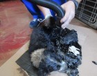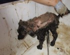 A tisztítás közben a kutyusok bundájának egy része le is jött, annyira beleragadt a kátrány.