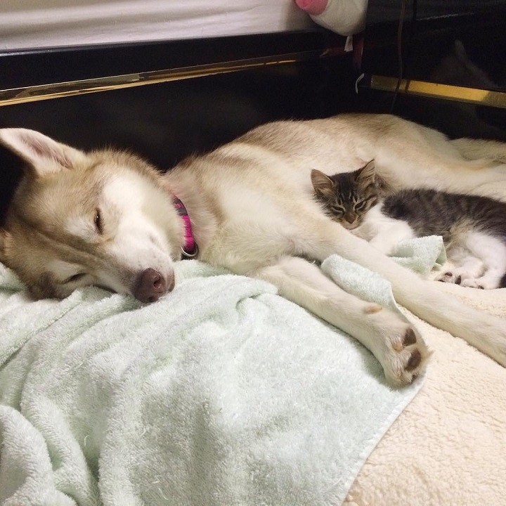 Rosie, a kiscica egészen kiskorában került a családhoz. A csöppség nagyon rossz állapotban volt, de Lilo, a szibériai husky befogadta, és saját kölykeként nevelte fel.