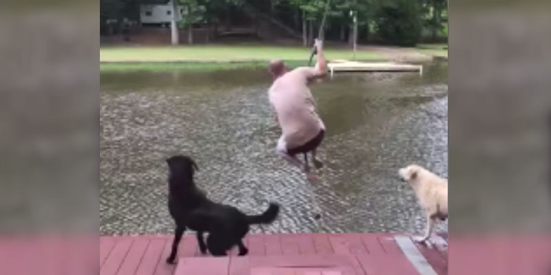A férfi két kutyájával kiment egy tóhoz és kellemesen töltötték a napot. Aztán a férfi úgy döntött, beugrik a vízbe és kisgyerek módjára elkapta a víz mellett lógó kötelet majd beugrott a tóba.