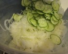 Reszelőn vagy konyhai robotgéppel szép vékonyra szeleteljük mindkettőt. Alaposan, de óvatosan összekeverjük, elkészítjük a felöntőlevet: a hozzávalókat elkeverjük, (kóstoljuk meg) a vízből egy keveset vegyünk ki és ebben oldjuk fel a Na- benzoátot, majd ezután öntsük a levet a szeletelt keverékre. Nem kell ! felmelegíteni, hidegen kell ráönteni!