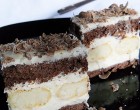 A tészta alapanyagait egy tálba tesszük és robotgéppel összedolgozzuk, majd kivajazott tepsibe öntjük. 180 fokon 40 percen át sütjük. A mascarponét krémesre keverjük a porcukorral. A tejszínt felverjük és a banánokat apróra szeleteljük, majd az egészet összekeverjük. A megsült tésztát kettőbe vágjuk és vastagon megkenjük a krémmel. A tetejét is bevonjuk vele, majd megszórjuk a csokoládéreszelékkel és legalább egy órára hűtőbe tesszük.