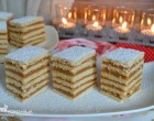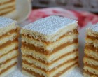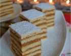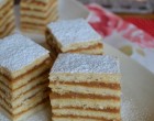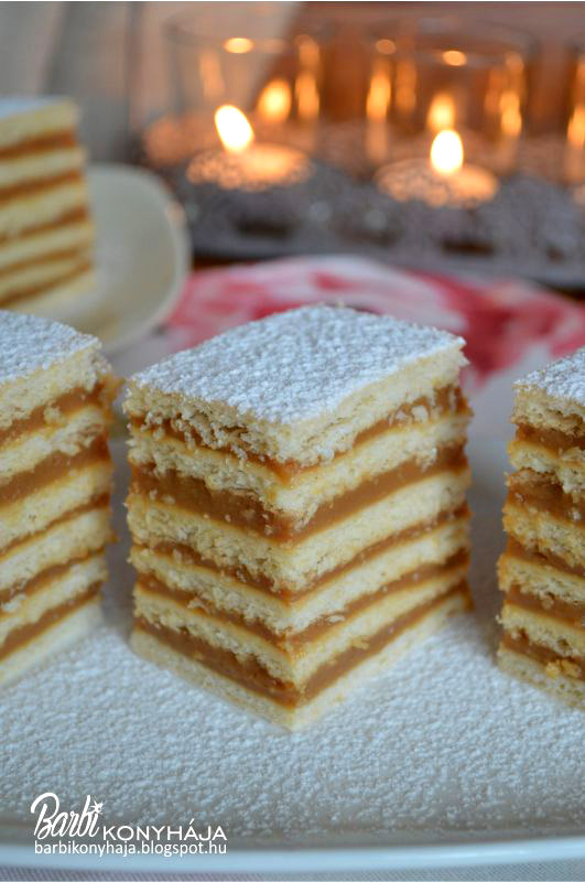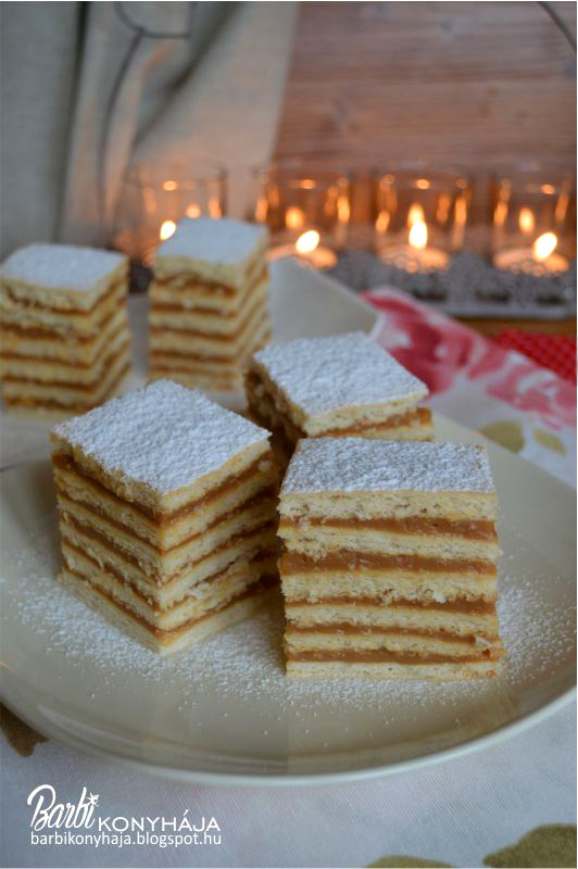 - A tésztákat a tepsi méretére nyújtjuk, és laponként 10 percig(!) sütjük. A második tésztalapnál már nem kell újra zsírozni és lisztezni a tepsit, mert ami rajta marad az bőven elég. A kisült lapokat egy palacsinta lapáttal alányúlva tegyük egy fa deszkára, szépen sorban egymásra.