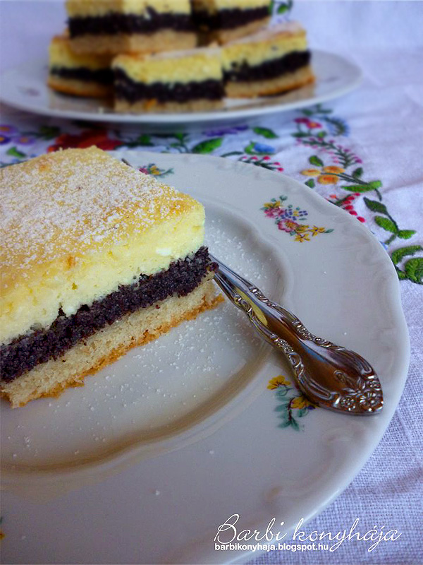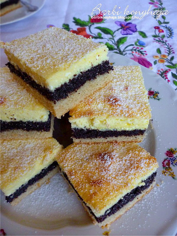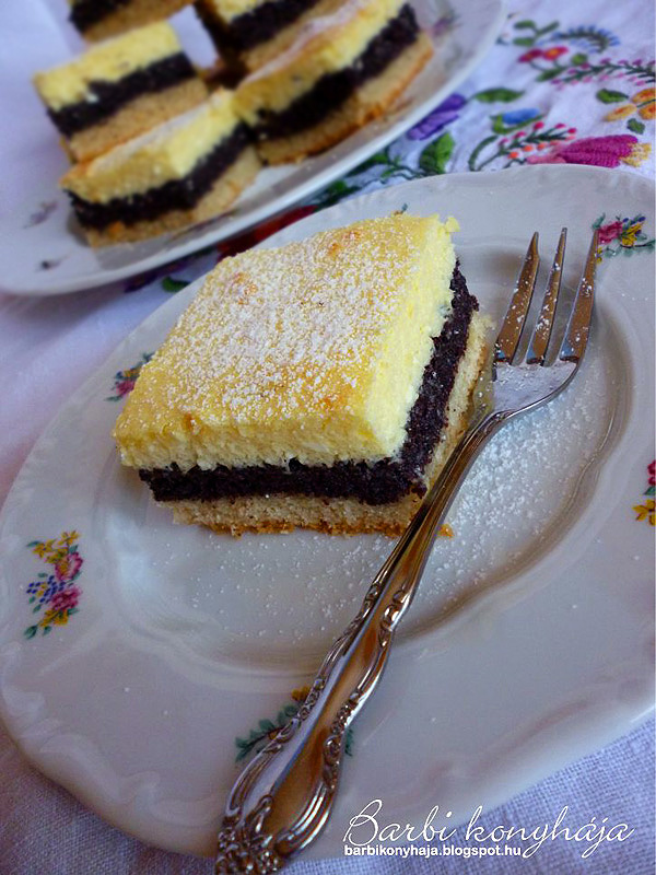 - A 3 tojásfehérjét kemény habbá verjük, összeforgatjuk a túrós masszával és a mákos rétegre simítjuk.