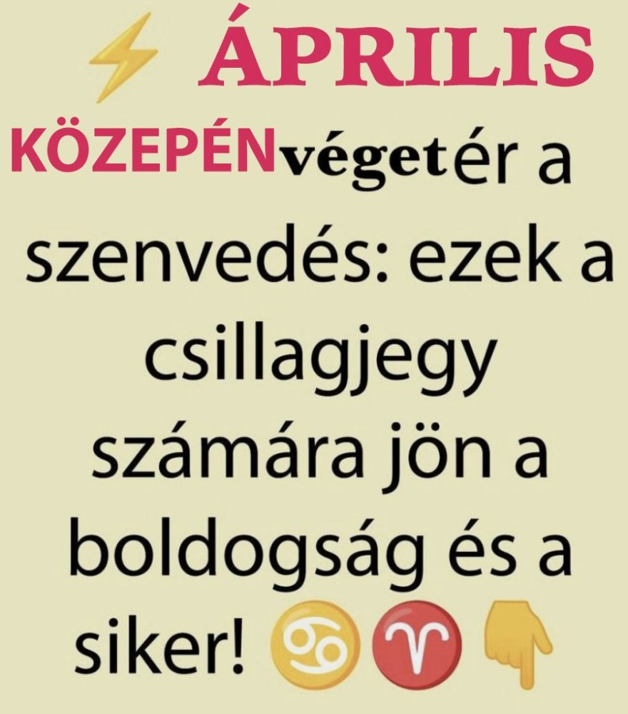 Április közepén végre elillan a feszültség. Egy családi ügy rendeződik, amire régóta vágysz. Most van itt az ideje az érzelmi gyógyulásnak. Egy új ismeretség melegséget hoz a szívedbe. Munkahelyeden végre megértik, mit képviselsz. Ha vállalkozásban gondolkodsz, most indulj el. Egy régi sérelem végleg begyógyul. Külföldhöz vagy utazáshoz köthető jó hír érkezik. A szíved ismét nyitni kezd valaki felé. Egy álmod közelebb kerül, mint gondolnád. Anyagiakban is fordul a kocka.Hét év szerencse vár, ha kedvelés és a "sok szerencsét" beírása után gördítesz lejjebb! 🍀