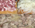 A hagymát aprítsd fel, a húst vágd kockára, tedd egy serpenyőbe, fűszerezd és kevés olajon süsd pár percig.