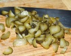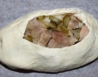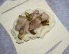 A kinyújtott tésztát vágd nagyobb téglalapokra, a közepére tégy egy adag burgonyapürét, erre húst és uborkát. A tészta oldalainál készíts egy vágást.