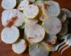 A cukkinit hámozzuk meg és szeleteljük fel, szórjuk meg borssal, tetszés szerint pirospaprikával.