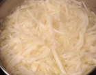 A káposztát vágjuk hosszú csíkokra és sós vízben főzzük 10 percig, majd szűrjük le, hagyjuk kihűlni.
