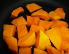 Hámozzuk meg a sütőtököt és vágjuk kockára. Egy serpenyőben melegítsünk olajat és süssük meg benne a sütőtök kockákat.