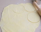 A tésztát nyújtsuk 3-5 mm vastagságúra, pohárral vagy szaggatóval szaggassunk 9-11 cm átmérőjű köröket belőle.