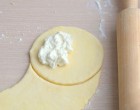 Tegyük a tölteléket a kiszaggatott körök egyik oldalába, a tészta másik oldalát hajtsuk rá és nyomkodjuk meg a széleit.