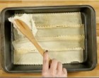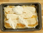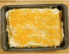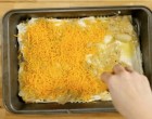 A tetejére lasagne tészta kerül, amit megszórunk reszelt sajttal.