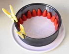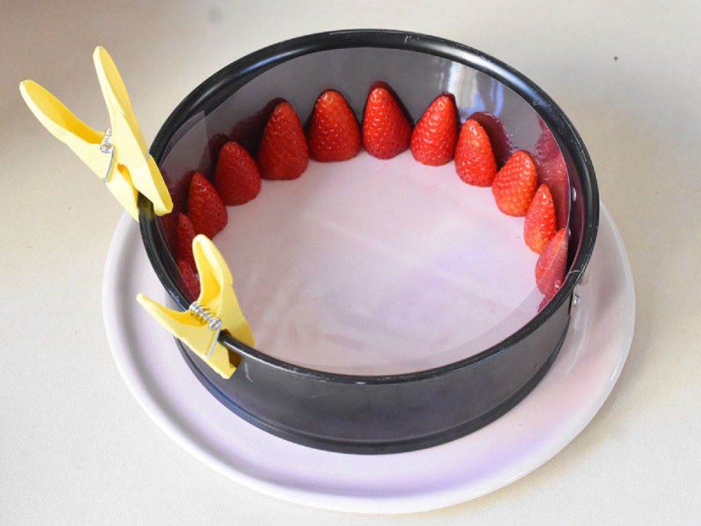 Keverjük össze a felvert habtejszínt, a mascarponét, a cukrot és a vaníliát, készítsünk egy könnyű krémet. Egy kapcsos tortaformát béleljünk ki fóliával. Csipesszel rögzítsük a fóliát. Az epret tisztítsuk meg a szárától, majd vágjunk ketté mindet és rakjuk körbe a tortaformában.