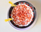 A krémre rakjunk egy sor félbevágott epret, majd tegyük rá a megmaradt tejjel meglocsolt piskótát.