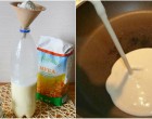 - A tölcséren keresztül öntsük bele a maradék tejet, a cukrot, és a többi hozzávalót (lisztet, szódabikarbónát és a sót). Újra zárjuk le és alaposan rázzuk össze.