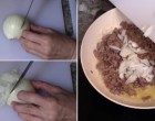 Tegyük a darált húst forró olajba egy serpenyőbe, az apróra vágott hagymát adjuk hozzá.