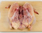 Készítsük elő az összes hozzávalót. Hasítsuk fel a csirkét hosszában, de ne vágjuk kettőbe.