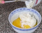 1. A tojások sárgáját különítsük el a fehérjétől. A három tojássárgájához adjuk hozzá az előzőleg turmixgépben összemixelt sajtot (vagy túrót) majd adjuk hozzá a sót és a cukrot is.