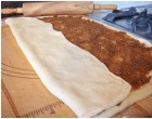 Nyújtsuk téglalap alakúra a tésztát és kenjük meg a töltelékkel, a tészta két oldalát hajtsuk rá a közepére.