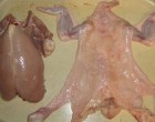 Mossuk meg a csirkét, a mellénél vágjuk fel, dolgozzunk óvatosan, hogy a bőr ne szakadjon több darabra. Húzzuk le a bőrét, a combokat és a szárnyakat hagyjuk meg.