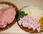 Csontozzuk ki a húst (a mellét, a hátát félretehetjük, jó lesz levesbe) majd daráljuk le. A kenyeret áztassuk be a tejbe, a sonkát vágjuk fel kockára vagy hosszúkás csíkokra, a sajtot reszeljük le. A zöldpetrezselymet vágjuk apróra, a paprikát pedig kisebb kockákra. Töltelék: keverjük össze a darált húst a kenyérrel ( mikor kivesszük a tejből nyomkodjuk jól ki), a sonkával, a sajttal, a felkockázott paprikával, a zöldpetrezselyemmel, a tojással, a tejszínnel, majd sózzuk, borsozzuk ízlés szerint.