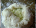 - A masszát alakítsuk hosszúkásra és nyolc-kilenc részre vágjuk fel. Az egyes darabokat sodorjuk ki kisujjnyi vastagságúra. A közepébe tegyük az előzőleg elkészített tölteléket, a széleit hajtsuk fel és kissé egyengessük el a tetejét. hagyjuk újabb két-három percet állni.