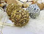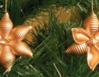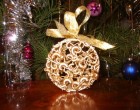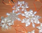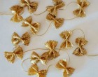 1. Szükségünk lesz masni formájú tésztára, arany színű festékre vagy lakkra, arany színű szalagra, ragasztópisztolyra és egy kis kreativitásra. Az aranyszínűre festett masni tésztákat kössük egymáshoz, aranyszínű szalaggal, felkerülhet a karácsonyfára, de a lakás dísze is lehet.