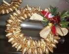 7. Különleges figyelmet érdemel a most következő fotón látható tésztából készült koszorú is. Készítsünk egy nagyobb kör alakú formát, kartonpapírból, majd ragasszuk rá az aranyszínűre festett tésztát, gyöngyöt és szalagot használhatunk kiegészítőnek. A kartonból kivágott kört bevonhatjuk színes papírral.