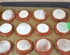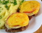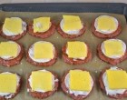 Tegyünk egy – egy szelet paradicsomot minden húsra és kenjük meg tejföllel. A tetejükre egy szelet sajt kerül.
