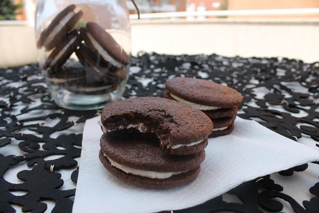 A lisztet, a sütőport, a cukrot, a kakaót és a szódabikarbónát összekeverjük. A vajat és a tojást hozzáadjuk, kidolgozzuk a tésztát. Kicsit ragacsos lesz, de ez a megfelelő állag. Golyókat formálunk a tésztából, majd ellapítjuk és sütőpapírral bélelt tepsibe tesszük. 180 fokos sütőben nagyjából 10 perc alatt megsütjük. A vajat a porcukorral kikavarjuk és vaníliaaromával ízesítjük. Mikor kihűltek a kekszek, megkenjük a krémmel és összeragasztjuk.