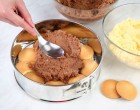 Egy 23 cm átmérőjű, lekapcsolható oldalú tortaformát kirakunk a keksszel, szorosan egymás mellé. Ráhalmozzuk a kakaós krémet és befedjük a fehér krémmel.