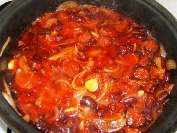 40 dkg vörös bab konzerv 2 db fokhagymagerezd 2 db vöröshagyma 10 dkg füstölt kolbász 2 evőkanál Rama margarin 2 evőkanál paradicsompüré 1 kiskanál pirospaprika 1 dl vörösbor só Cayenne bors Elkészítés