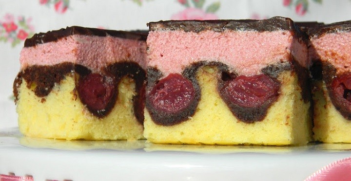 A tojások sárgáját 12 evőkanál forróvízzel géppel 10 percig, kézzel 1/2 óráig keverjük, utána beleteszünk 30 dkg porcukrot és azzal még 5 percig keverjük. Hozzászitálunk 30 dkg lisztet, amibe előzőleg beleelegyítettük a sütőport. A massza negyedét egy másik edénybe tesszük és hozzákavarjuk a kakaóport. A tojáshab háromnegyedét a fehér tésztához, a megmaradt részt, a barna tésztához kavarjuk. Kivajazott, kilisztezett nagyméretű tepsibe öntjük a fehér tésztát, majd rá a kakaósat. A tetején egyenletesen szétterítjük a kimagozott és lecsurgatott meggyet (vagy befőttet). Ezután mérsékelt lángon készre sütjük. A tepsiben hagyjuk kihűlni. Ha már kihűlt, a következő krémet tesszük rá: