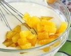 Készítsük el a krémet. Oldjuk fel a zselatint a vízben. Kézi robotgéppel keverjük össze a túrót, a tejszínhabot és a porcukrot. A feloldott zselatint adjuk hozzá a túrós keverékhez, a barackot, vagy az ananász vágjuk kockára és keverjük a krémbe. Tegyük az elkészített krémet hűtőbe. Készíthetjük friss gyümölcsökkel is, tetszés szerint bármilyennek.