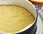 Készítsük el a tésztát. Verjük fel a tojásfehérjét a cukorral kemény habbá, majd adjuk hozzá egyenként a tojássárgáját és keverjük össze. Kanalanként adjuk hozzá a lisztet, majd óvatosan keverjük össze. Tegyük ezt a masszát egy kapcsos tortaformába, amit kibélelünk sütőpapírral.