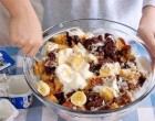 Tegyük a tésztakockákat egy nagyobb tálba, vágjuk fel a banánt karikára és tegyük a felkockázott tésztához, öntsük rá a 600 g joghurtot és keverjük össze.