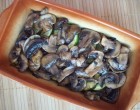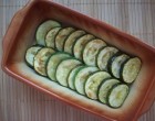 Egy kiolajozott sütőformába tegyük bele a cukkinikarikákat, szorosan egymás mellé, majd halmozzuk rá a gombát.