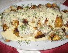 A húst csíkokra vágjuk és fűszerezzük. A szokásos módon panírozzuk, lisztbe, tojásba, majd zsemlemorzsába forgatjuk és forró olajban megsütjük. Papírtörlőre szedjük, hogy felszívja a fölösleges zsiradékot. A főzőtejszínt egy edénybe öntjük és felmelegítjük, beletesszük a vajat és a reszelt parmezánt, folyamatosan kavargatjuk. Lassú tűzön addig főzzük, amíg a sajt megolvad, majd félrehúzzuk és hagyjuk egy kicsit hűlni. A tejfölt hozzákeverjük és a szószt a húsokra öntjük. A felaprított petrezselyemzöldet rászórjuk és tálalhatjuk is.