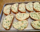 Szeleteljük fel a kenyeret és tegyük a szeleteket egy tepsibe. Melegítsük elő a sütőt 240 fokra. Kenjük meg a kenyér szeleteket a sajtos fokhagymás krémmel.