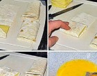 Vágjuk fel a tortilla lapokat 10 cm vastagságú csíkokra, a sajtot pedig keskenyebb csíkokra. Tegyünk mindegyik tortilla darabba egy darab sajtot és tekerjük fel (hajtsuk össze), majd mártsuk bele a felvert tojásba és süssük ki forró olajba. Jó étvágyat!