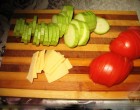 A cukkinit, vagy a zsenge főzőtököt mossuk meg, ha szükséges hámozzuk meg. Vágjuk karikára, a paradicsommal együtt. A sajtot vágjuk szeletekre.