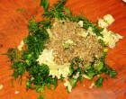 A kaprot és a petrezselymet aprítsuk fel és keverjük az olajhoz a zúzott fokhagymával együtt. Ha van otthon friss bazsalikom, akkor azt is vágjuk apróra és adjuk hozzá, de szárítottat is használhatunk.