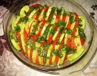 Egy hőálló tálba tegyük a zöldségeket: cukkini, paradicsom, sajt, így folytassuk amíg el nem fogynak. Öntsük rá az olajos keveréket és 180 fokos sütőben süssük nagyjából 35 percig.