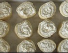 Az így kapott töltött tekercset vágjuk fel szeletekre. Rakjuk a csigákat egy sütőpapírral bélelt tepsibe, hagyjunk helyet közöttük, majd takarjuk le a tepsit és hagyjuk állni szoba hőmérsékleten 40 percet. Ennyi idő alatt a tészta még kelni fog.