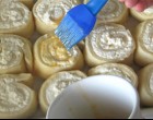Sütés előtt kenjük le a tekercseket felvert tojással, majd 180 fokra előmelegített sütőben süssük nagyjából 30 perc alatt készre őket.